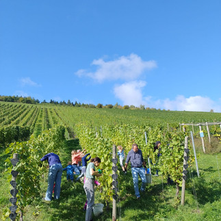 Ende September war es endlich soweit: In unserem Kinderwingert konnte gelesen werden! Bei schönstem Sonnenschein waren Kinder und Eltern fleißig im Einsatz, sodass die Trauben bald erst in den Eimern und dann in der Bütte landeten. Dabei wurde viel erzählt, gelacht – und so mancher Marienkäfer gerettet.
